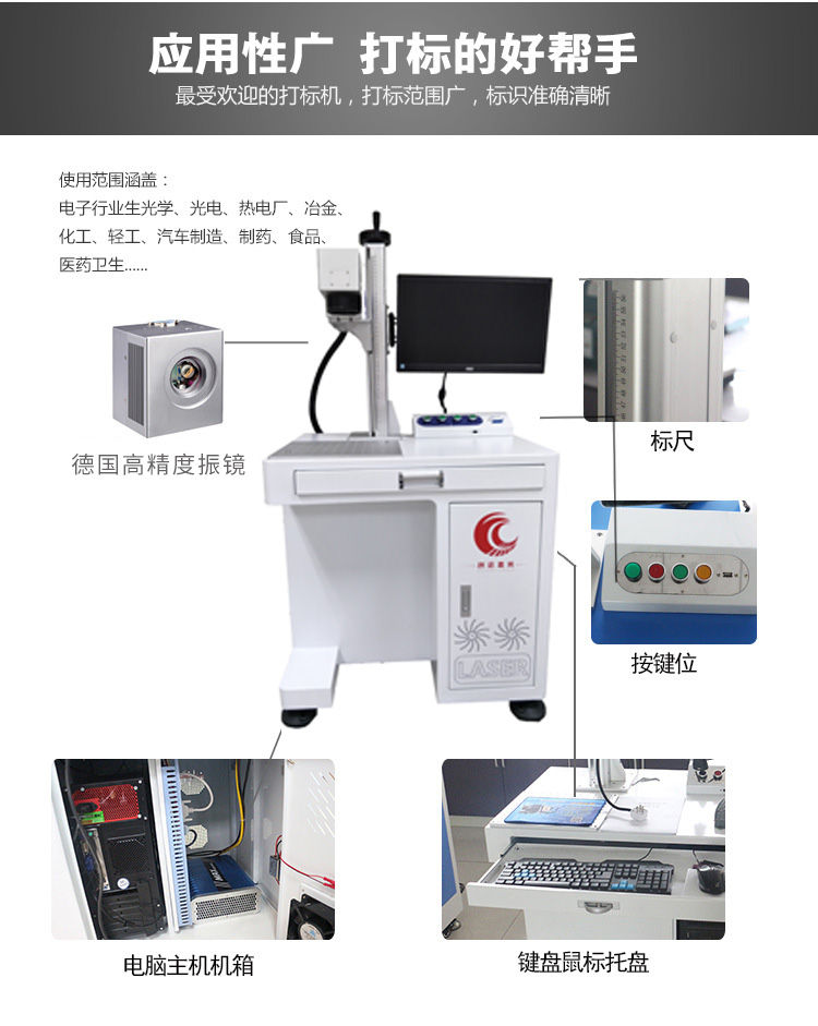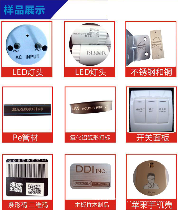 塑胶透光按键、IC芯片、数码产品部件、精密机械、珠宝首饰、洁具、量具刃具、钟表眼镜、电工电器、电子元器件、五金饰品、五金工具、手机通讯部件、汽摩配件、塑胶制品、医疗器械、建材管材等高精度产品标识。
