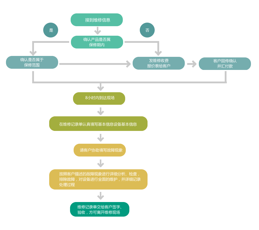 4.售后服务响应时间8小时,接到用户报修电话,售后工程师24小时内有明确答复或到达设备现场。故障不排除,维修人员不撤离;